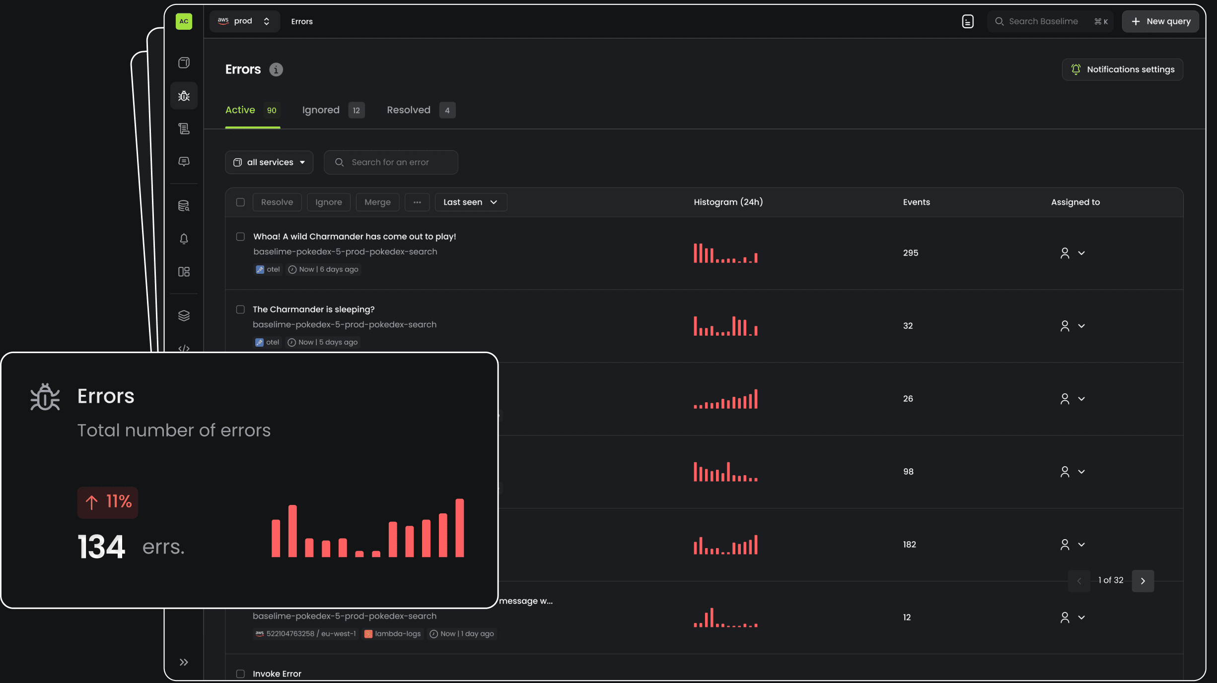 Stop hoping on users to report bugs and issues. Baselime automatically tracks errors in your logs, traces and wide events in real-time.