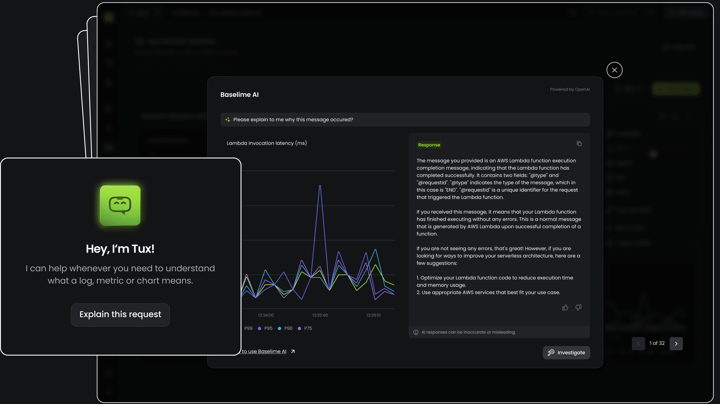 Meet Tux, your Observability AI Copilot. Tux surfaces insights, debugs with you and recommends fixes in your codebase.