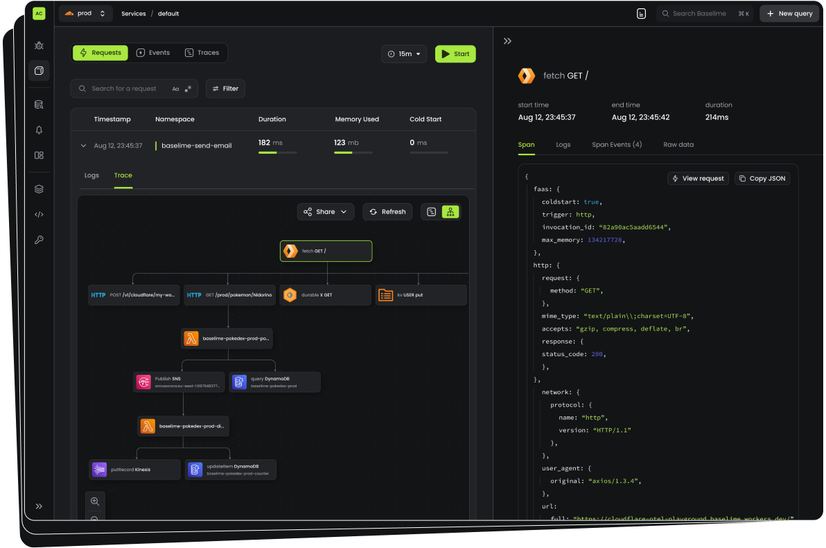 OpenTelemetry distributed tracing, logs and metrics, all instantly queryable and searchable