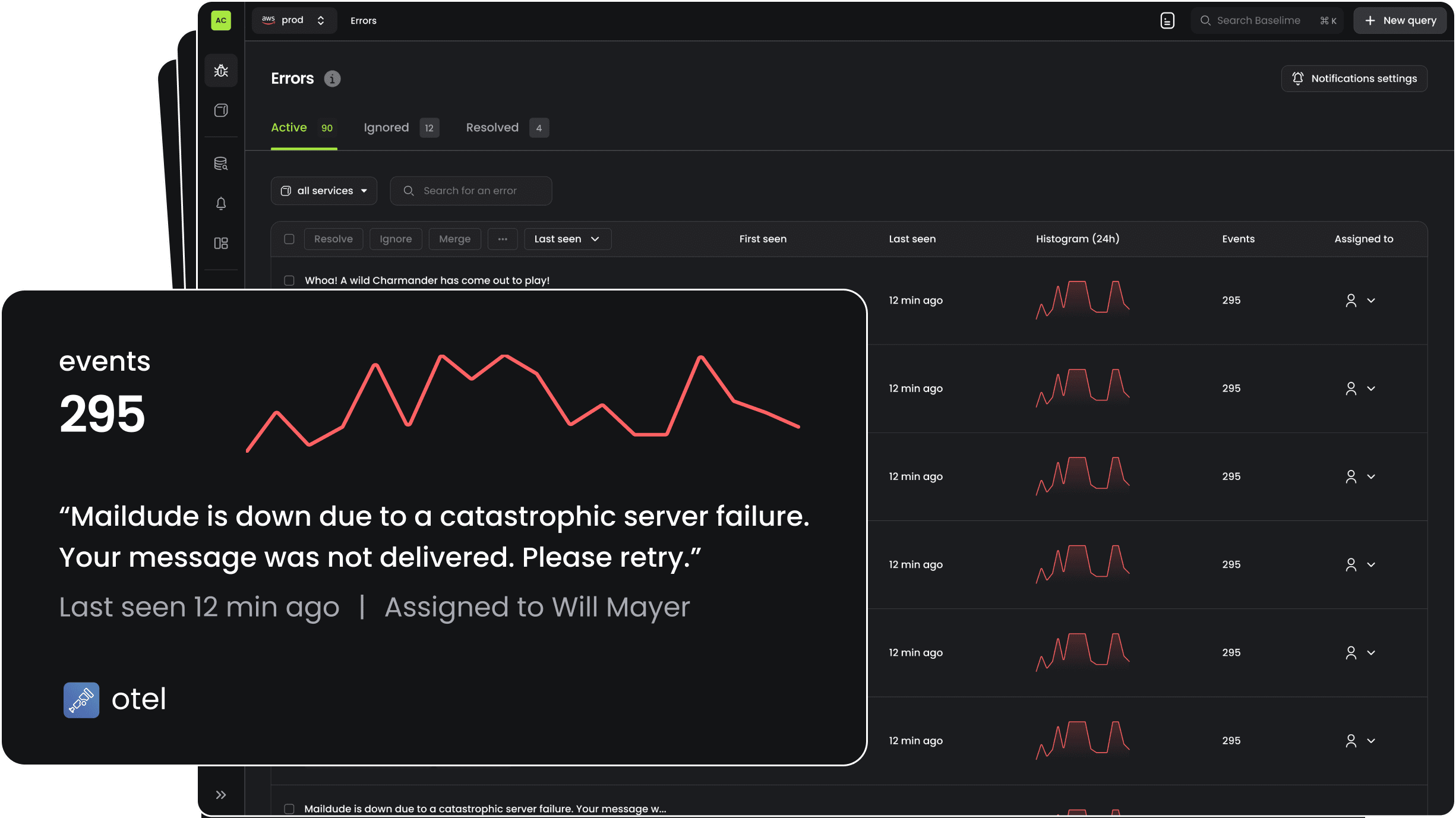 Receive instant alerts as Baselime captures errors in real-time within their context.