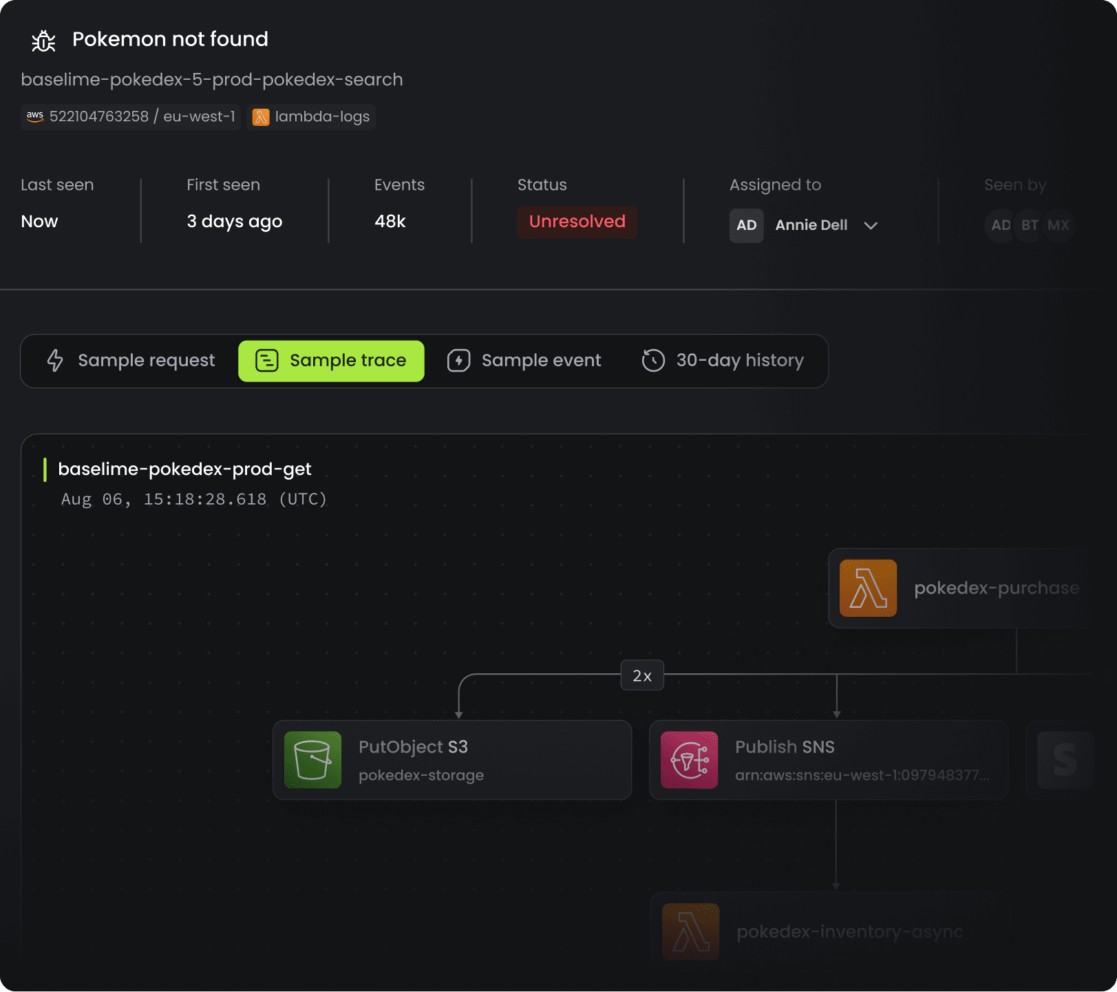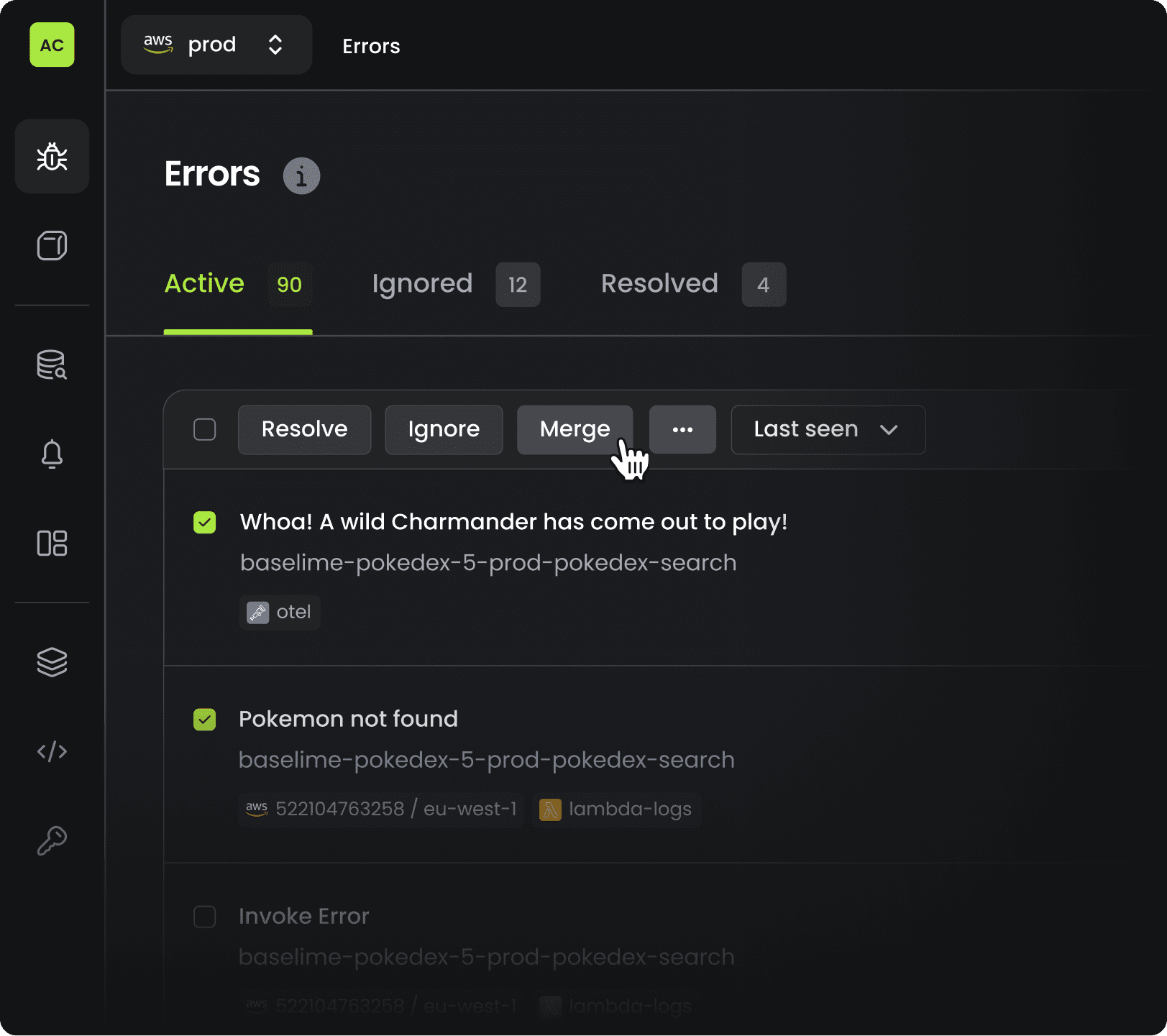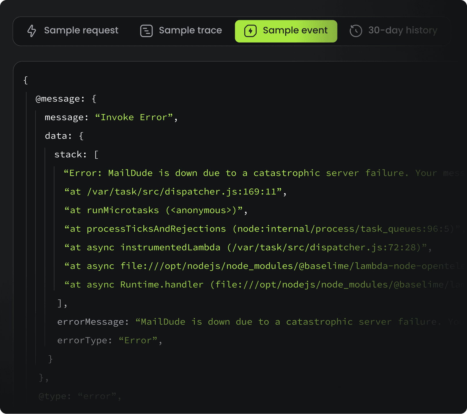Baselime's real-time error tracking captures errors within the context of your applications. No need for an SDK; all errors from your logs and traces are automatically captured and surfaced.