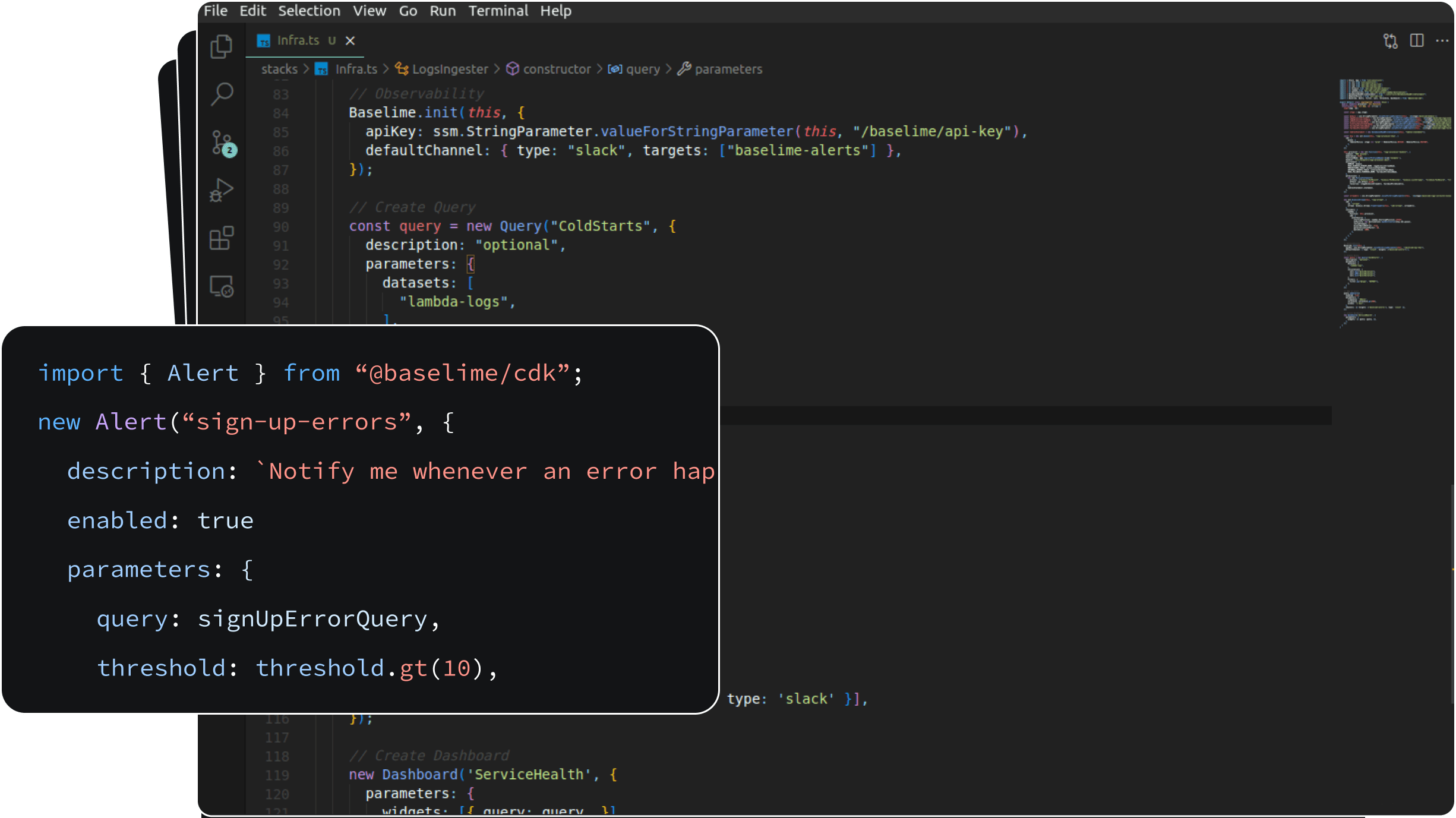 With Baselime's Observability as Code, you can manage your entire observability lifecycle without ever leaving your code editor. Create alerts as you are building your application, without loosing any context.